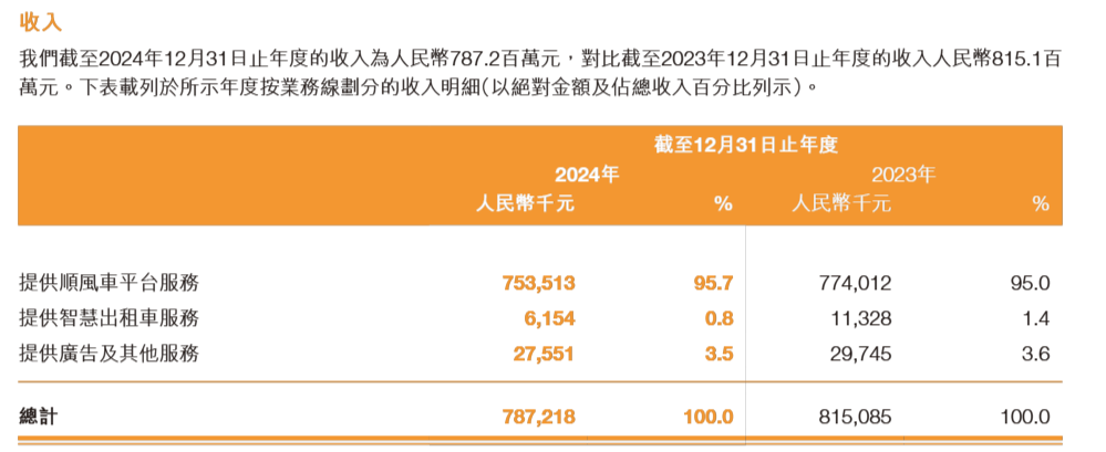 4月29日,嘀嗒出行(02559.HK)发布2024年年报:过去一年公司实现营业收入7.87亿元,同比下降3.4%。其中,全年提供顺风车平台服务的收入7.54亿元,占到公司总营收的95.7%,比2023年提升0.7个百分点;提供智慧出租车服务的收入萎缩到615.4万元,2023年为1132.8万元。