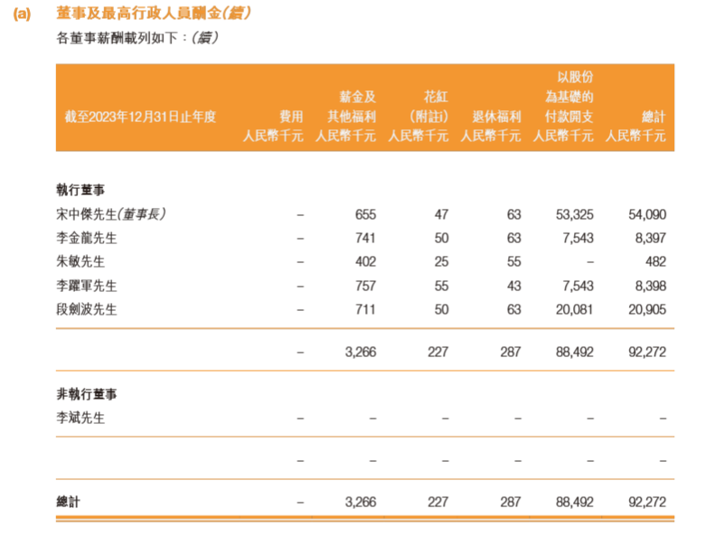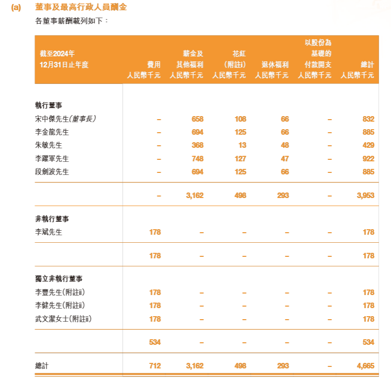 从高管收入情况看,因为2024年薪酬中不含股权激励收入,包括宋中杰、李金龙、李跃军、段剑波等高管的收入大幅下降,例如董事长宋中杰2023年年薪高达5409万元,其中5332.5万元是股权激励,而2024年的年薪降到83.2万元,其中薪金福利、花红、退休福利分别为65.8万元、10.8万元、6.6万元。