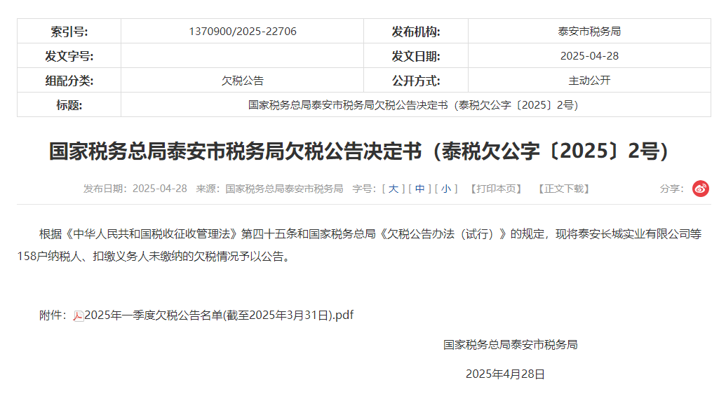 近日,国家税务总局泰安市税务局发布欠税公告,涉及泰安长城实业有限公司等158户纳税人、扣缴义务人。