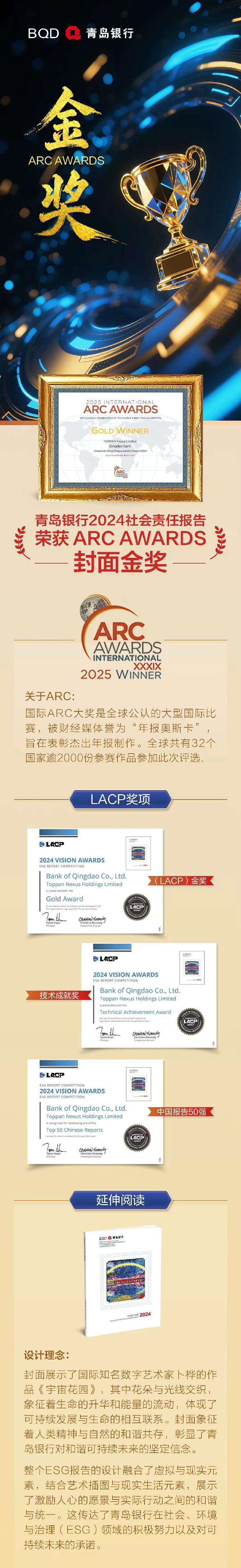 作为“A+H”上市银行,青岛银行也高度重视社会责任(ESG)报告的编制和发布工作,已连续9年披露独立的社会责任报告(ESG)报告,以推动企业可持续发展。历年报告紧密围绕ESG指标体系进行披露。2024年度报告更创新设计风格,系统披露了青岛银行在服务国家战略、赋能实体经济、促进民生改善以及推动绿色低碳转型等领域的创新实践与突出成果,一举斩获有“年报奥斯卡”之称的美国媒体专业联盟(LACP)全球ESG报告竞赛金融业金奖。