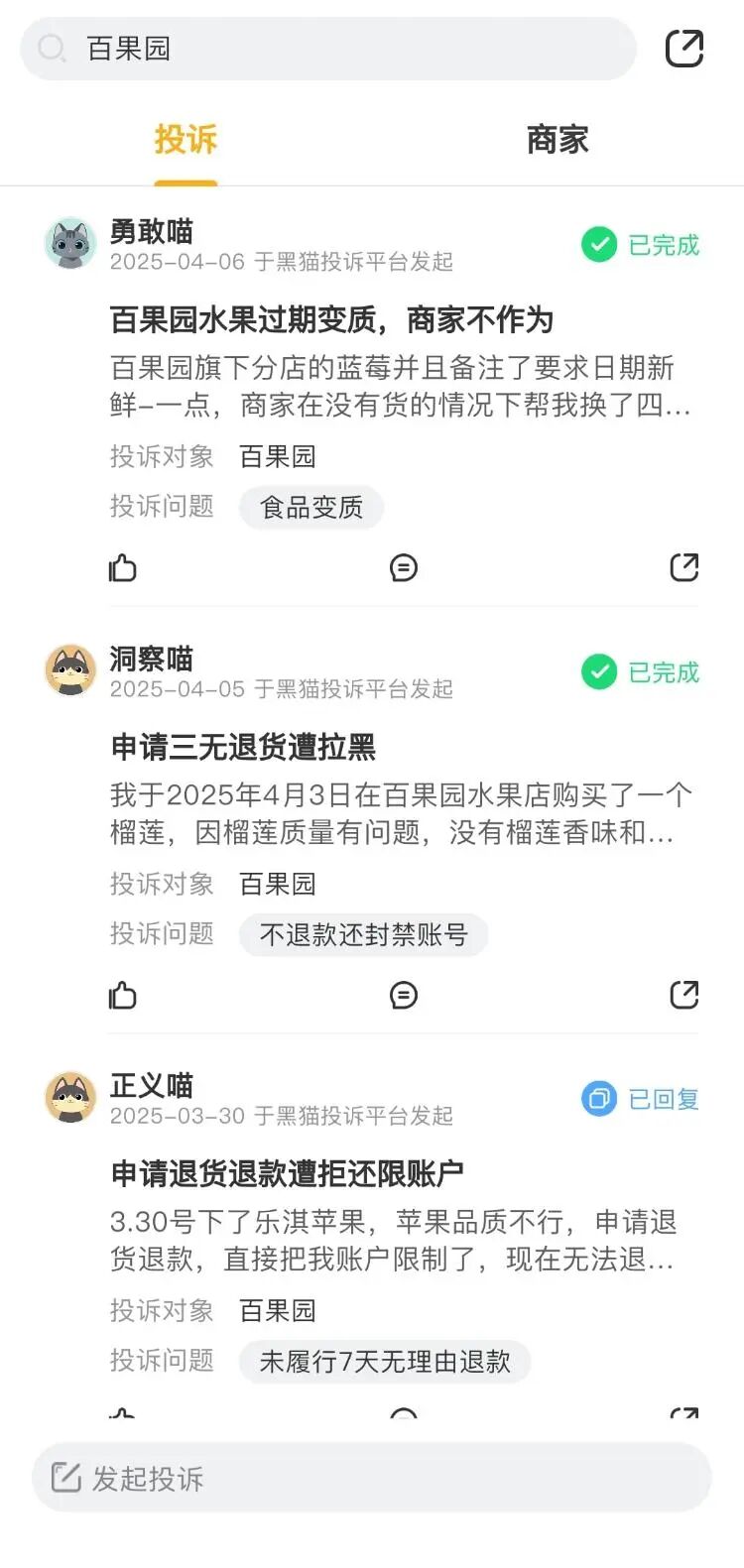 黑猫投诉平台显示,水果变质、退款维权占比较大