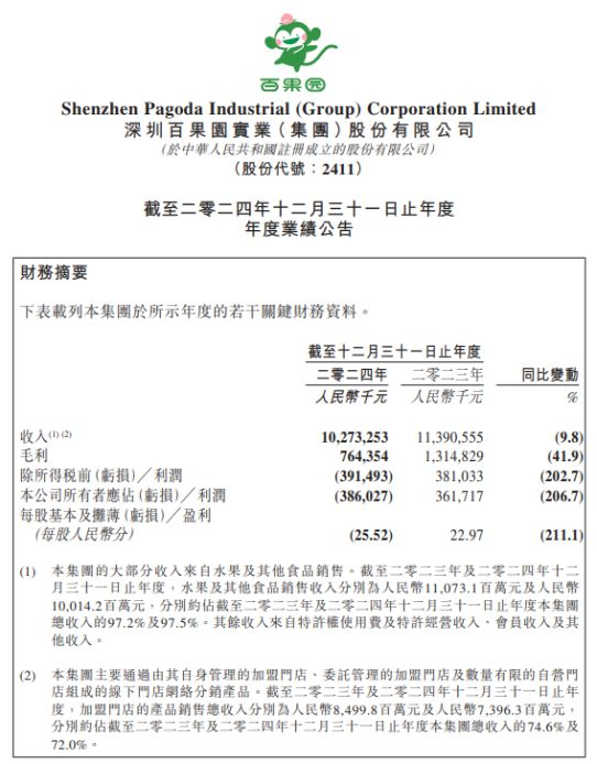 据其2024年的财报显示,公司实现收入102.73亿元,同比下降9.8%,除所得税前亏损为3.91亿元,而上年同期则盈利3.81亿元,这是近五年来百果园首次出现净利亏损。