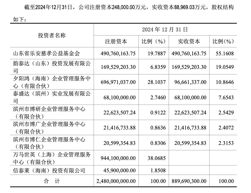 京博集团近年来股东频繁调整,在2024年年报中,京博集团还披露了公司最新的股权结构,显示截至2024年12月31日万马世英(上海)企业管理服务中心(有限合伙)是集团第一大股东,拥有集团38.06%的注册资本,第二大股东是夕阳鸿(海南)企业管理服务中心(有限合伙),拥有集团28.1%的注册资本,第三大股东是山东省乐安慈孝公益基金会,拥有集团19.78%的注册资本。