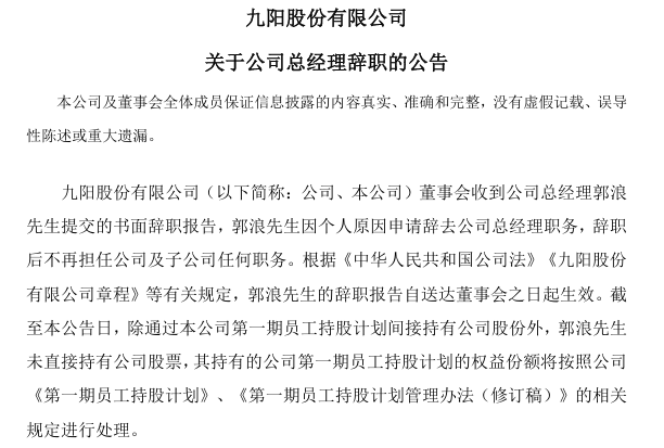 5月8日晚间,九阳股份(002242)发布公告称,公司董事会收到公司总经理郭浪提交的书面辞职报告,郭浪因个人原因申请辞去公司总经理职务,辞职后不再担任公司及子公司任何职务。九阳股份总经理职务暂时由公司财务总监阚建刚代行。
